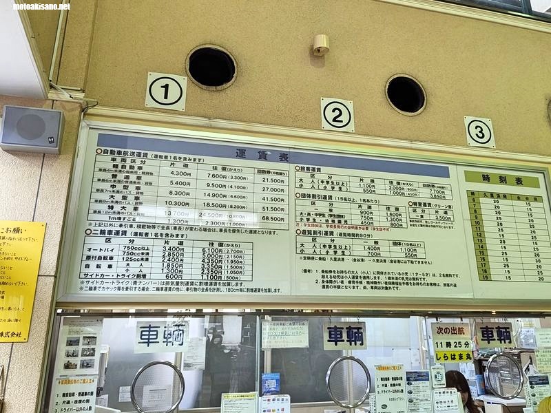 乗船用のバイクスペースにバイクを置いてチケットを購入(125ccバイクは運転手込で2400円)。
