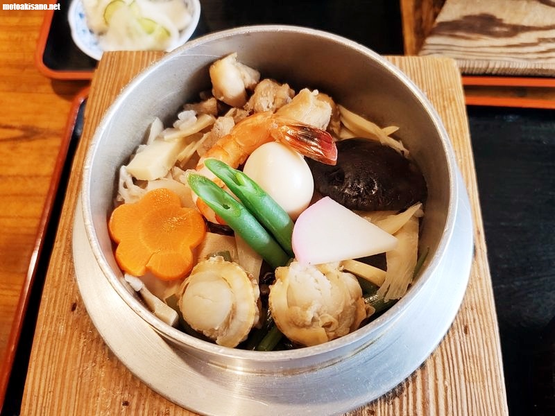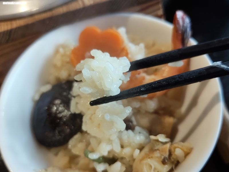 エビ、鶏肉、シイタケ、ウズラ玉子、ニンジン、タケノコ、ゴボウ、カマボコ、山菜各種…、本当に具沢山で、それに負けないくらいの米の存在感。