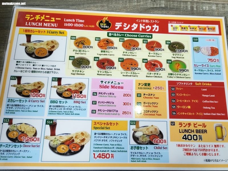 早速メニュー拝見ですが、ランチメニューに限ってはいたって普通の街のインド料理屋さん的なメニュー。