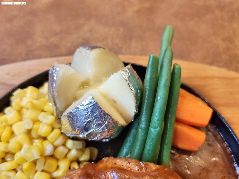 コーン、インゲン、ニンジン、ジャガイモ。ハンバーグの付け合わせとしてはお手本みたいなラインナップ。