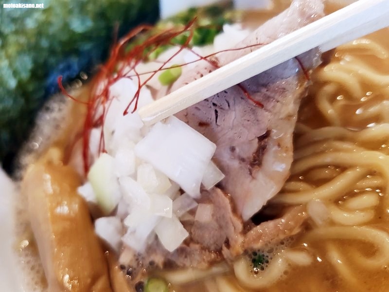 割と大き目のしっとりとしたタイプのチャーシューに太めのメンマ、タマネギ、青ネギ。