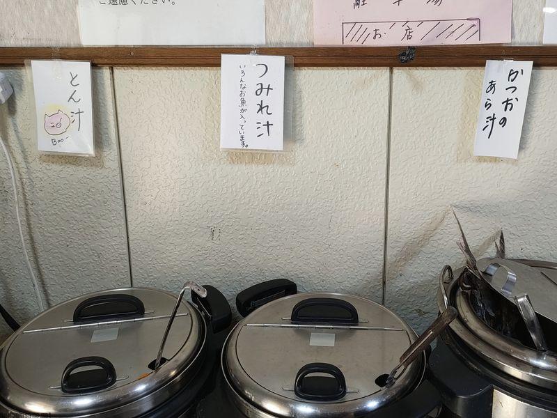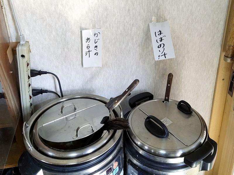 この日は、かじきのあら汁・はばのり汁・かつおのあら汁・つみれ汁・とん汁、というラインナップ。