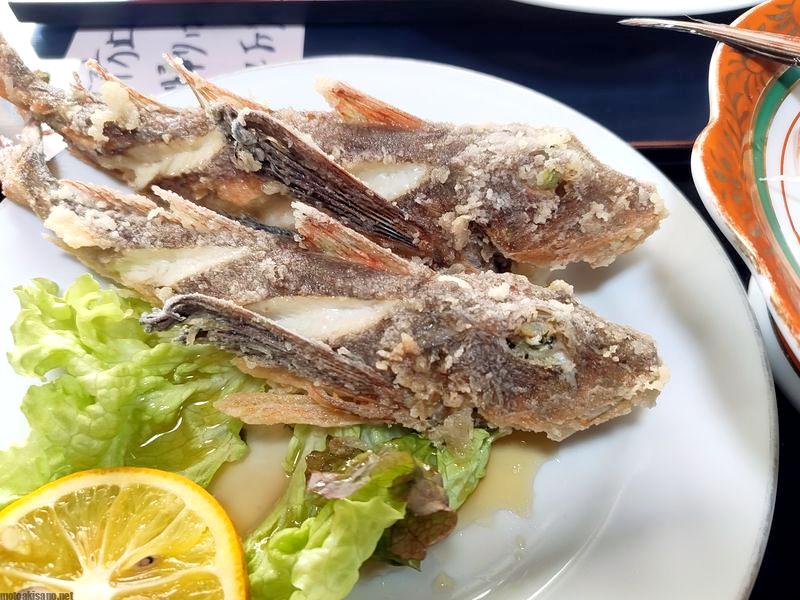 メニューでは「魚唐揚げ」との事なので、青魚系の竜田揚げみたいなものを想像していたのですが、ホウボウの丸揚げが出てきてビックリ(笑)
