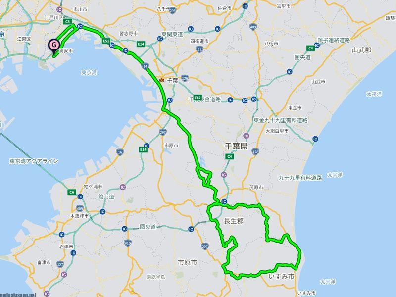長柄ダム付近から茂原街道に入り、R16~R357で浦安まで。